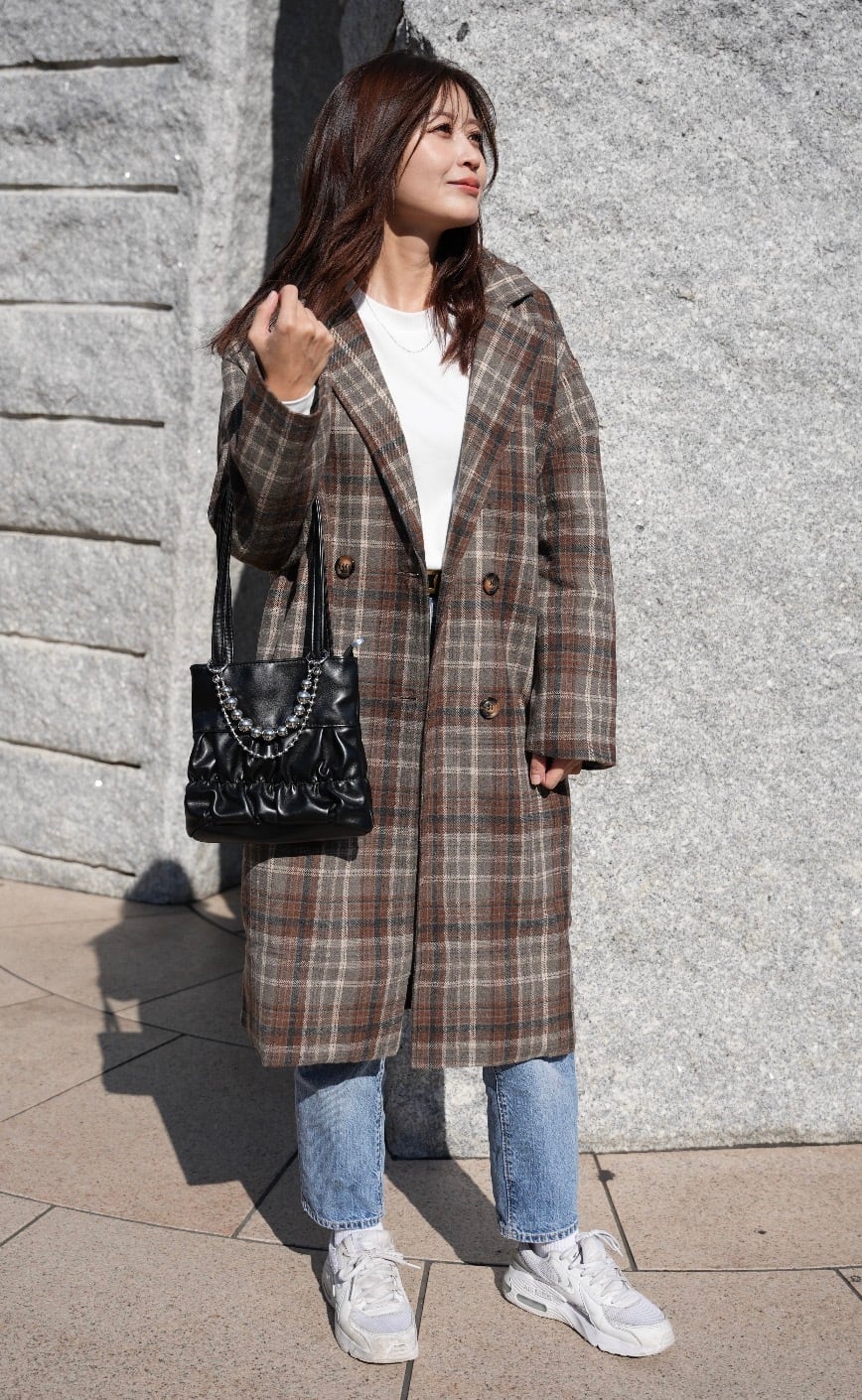 ビジューをつけて、肩掛けをはずしてラグジュアリーなニュアンスコーデ
